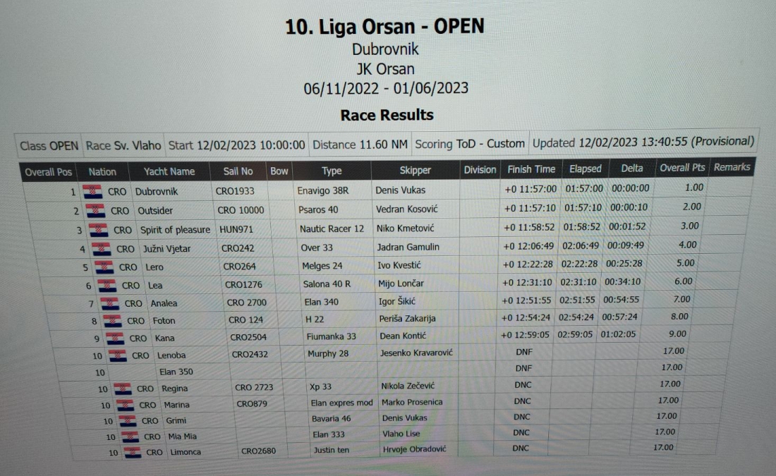 Ukupno vrijeme jedrenja Dubrovnika bilo je sat i 57 minuta, dok je Outsider za njim kasnio samo 10 sekundi, dok je Spiritu trebalo skoro dvije minute više nego Dubrovniku.