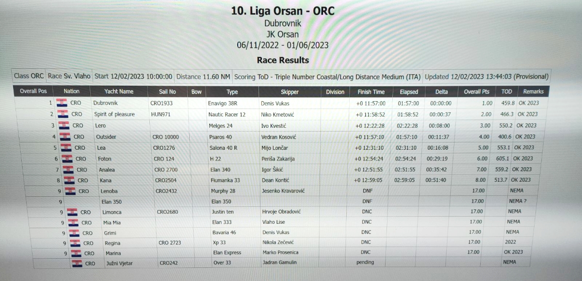Što se tiče ORC-a i korigiranih rezultata, Dubrovnik trijumfira i u toj kategoriji, dok drugo mjesto zauzima Spirit of Pleasure, a na postolje se još ugurao i maleni Lero, dok je Outsider trebao biti bar četiri minute brži da bi ostao u vrhu.
