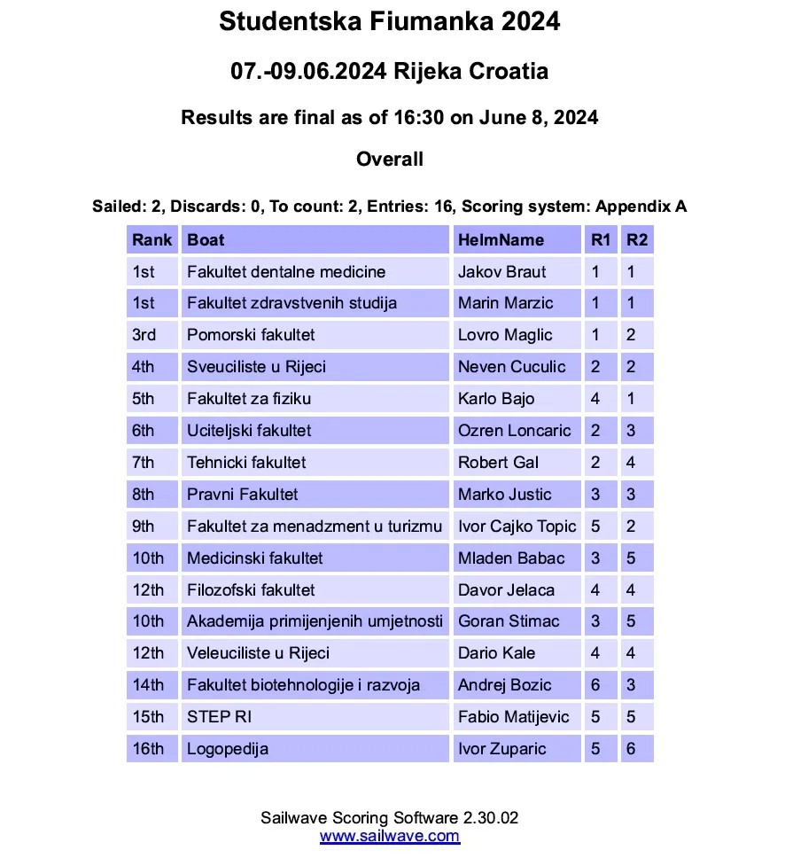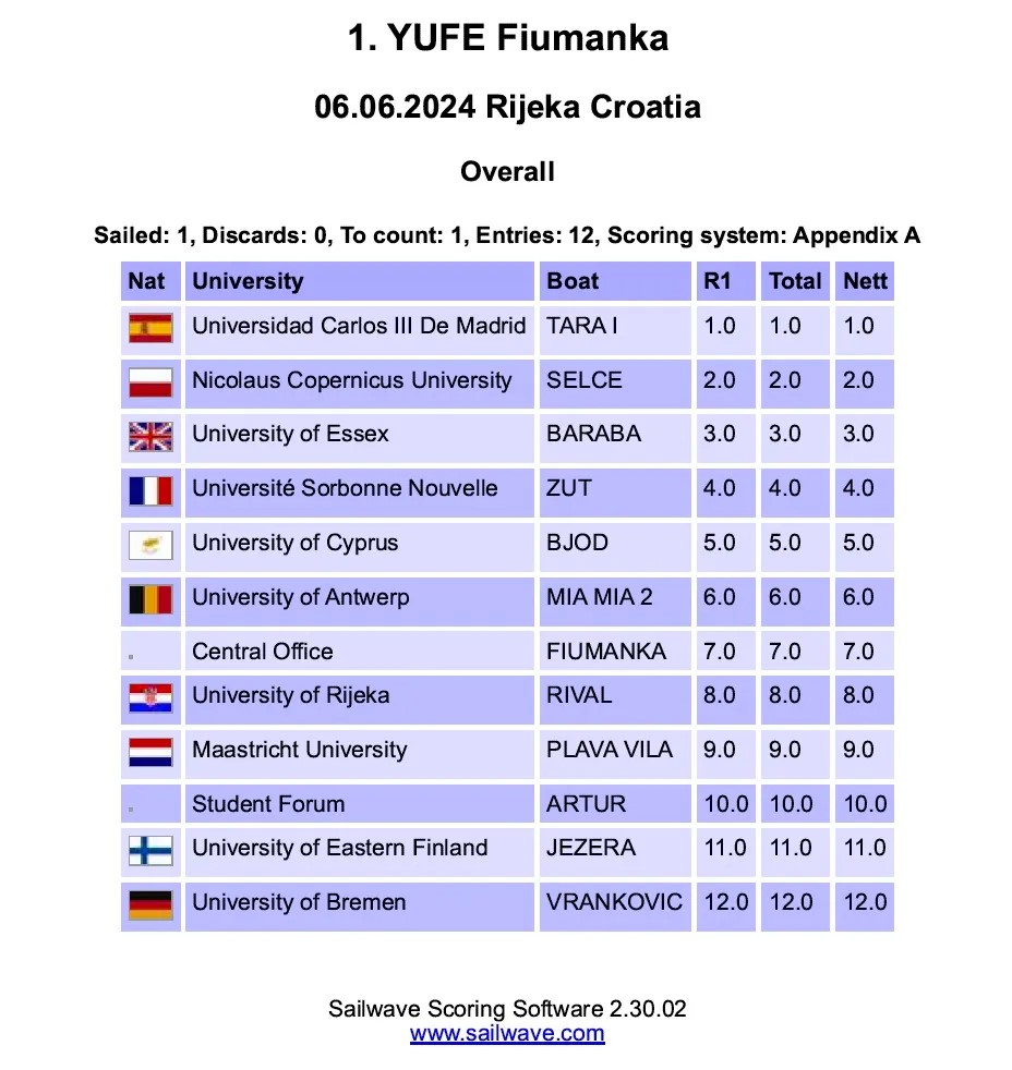 U četvrtak 6. lipnja odjedrena je 1. Međunarodna studentska regata – YUFE Fiumanka. Uz domaće predstavnike sa Sveučilišta u Rijeci, jedrili su predstavnici s još 11 Europskih sveučilišta!