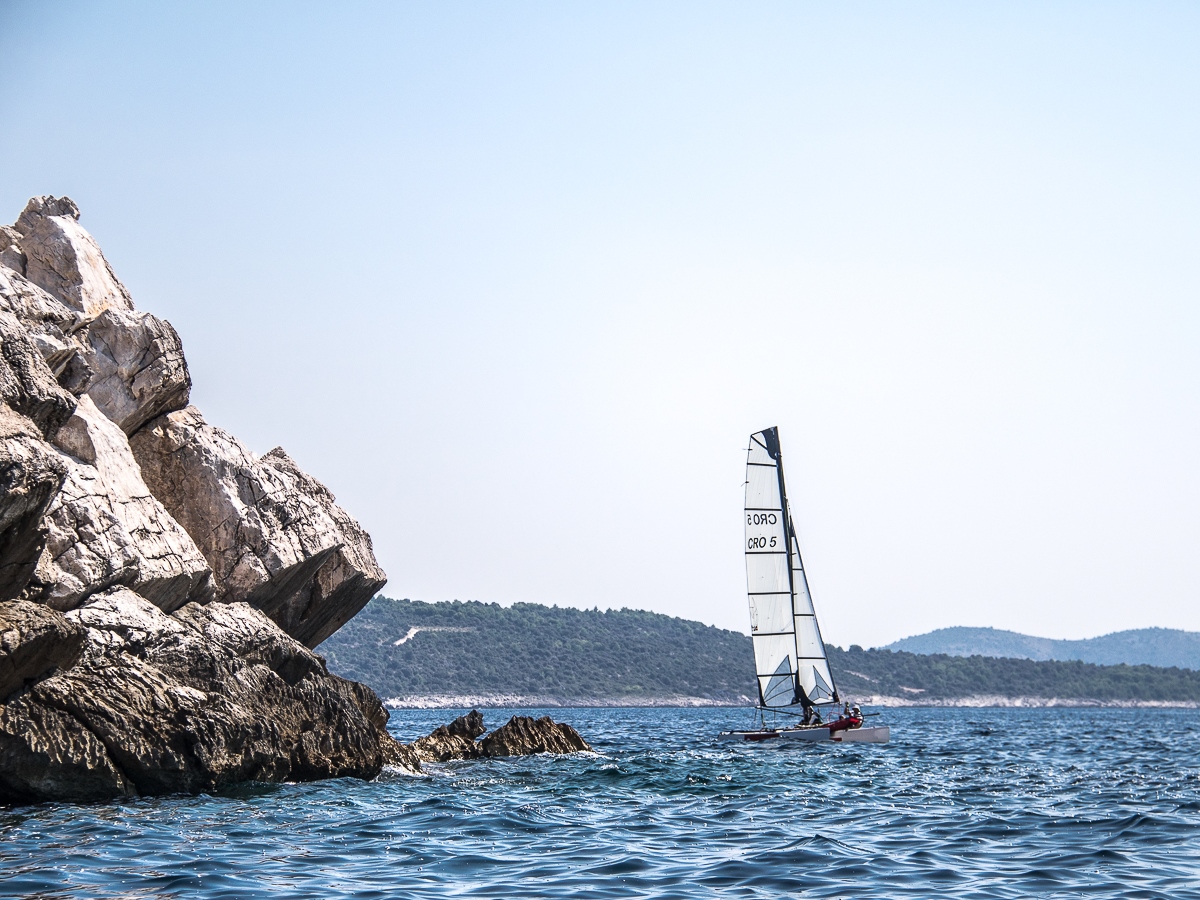 Trenutno smo skupina od 10 do 15 katamarana koji se pojavljuju na našim regatama. Uglavnom smo svi na potezu između Primoštena i Šimuna, a jednom smo imali na regatama posade iz Dubrovnika i Podstrane. U posljednje vrijeme počeli su se i stranci pojavljivati na našim regatama, ali prevladava desetak uvijek istih posada. Rekord regate je 15 katamarana, a ove godine nas je bilo samo šest, ali zato smo svi bili u istoj klasi i nikog se nije trebalo dugo čekati. Tako smo u subotu napravili dugu navigaciju u tri etape. Jedrili smo od Primoštena preko Krbele do ulaza u Morinjski zaljev. Zatim oko Krpnja do Zlarina. I posljednja etapa je bila iz Zlarina, između Sestrica i natrag u Primošten. Ruta je imala oko 30 NM, a mi smo je zajedno sa startevima i čekanjima prešli za 3 i pol sata! Stvarno je bilo krasno. Prije polaska iz Primoštena predvidjeli smo da na Krbeli bude pomoćni cilj u slučaju da ne bude dovoljno vjetra, ali nije bilo potrebne i odjedrili smo kompletnu rutu.