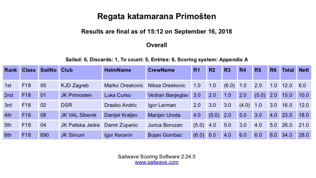 Do sada su se regate katamarana u Primoštenu organizirale za nekoliko različitih klasa. Ove godine je nastupilo samo 6 posada, ali su sve bile u klasi F18. Inače je riječ o klasi o kojoj je bilo riječi u članku Nacra stiže u Hrvatsku gdje je bilo riječi o pripremanju dvojca Marenić - Šavar za prelazak u olimpijski katamaran klase Nacra 17.