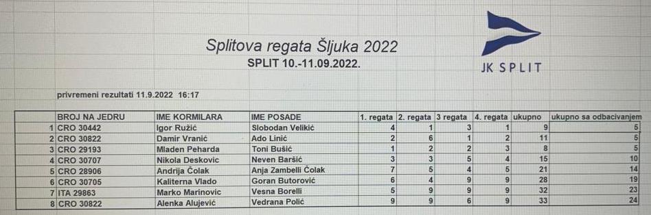 Stvarno zanimljiva situacija desila se na kraju regate klase Šljuka koju je od 10. do 11. rujna organizirao JK Split. Naime, sve tri prvoplasirane posade nakon odbacivanja imale su po pet bodova!