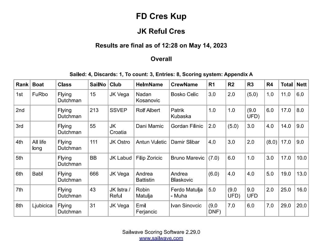 Trećeplasirana posada, Mamić & Filinić iz YC Croatia, imala je potpuno jednake rezultate kao i četveroplasirana posada Vuletić & Šlibar iz JK Oštro, a konačni plasman definiran je na osnovu boljeg rezultata Mamića i Filinića u posljednjem plovu.