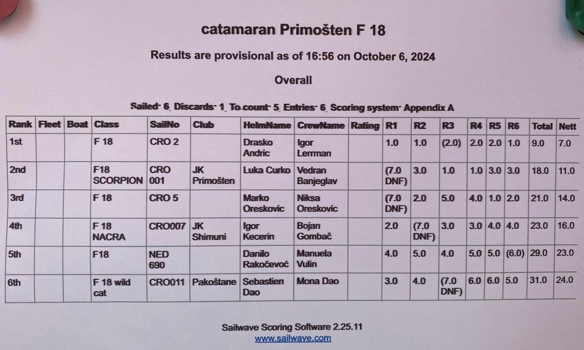 Petog i šestog listopada u Primoštenu se jedrila tradicionalna regata katamarana klase F18. Organizatori su bili članovi lokalnog jedriličarskog kluba, a sudjelovalo je šest posada.
