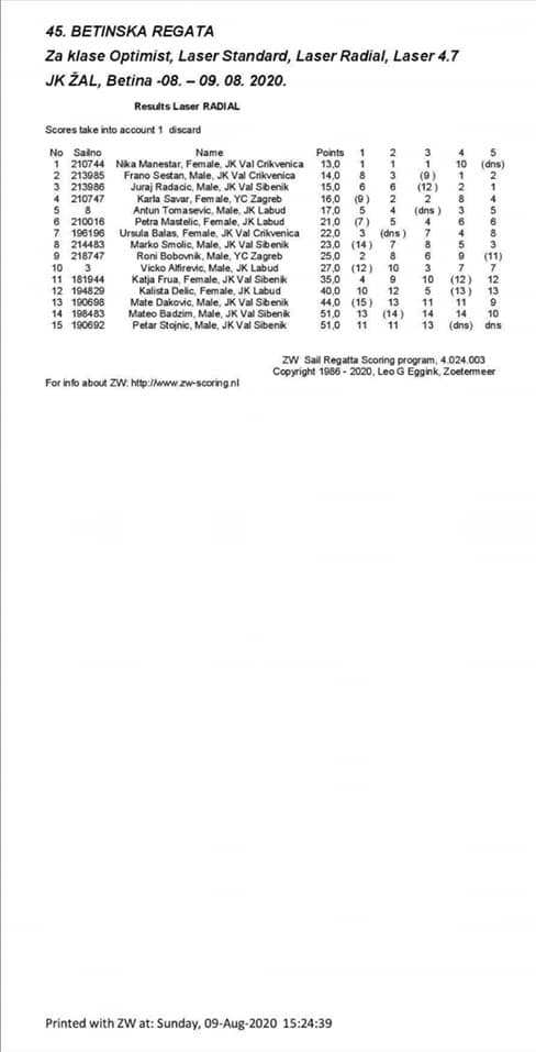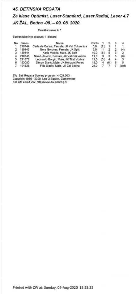 U subotu i nedjelju, 8. i 9. kolovoza, Optimisti, Laseri 4.7 i Laseri Radial su se okupili u Betini na 45. regati za male klase. Definitvno jednoj od najdugovječnijih regata na Jadranu, kao i jednoj od najpopularnijih ljetnih regata na srednjem Jadranu.