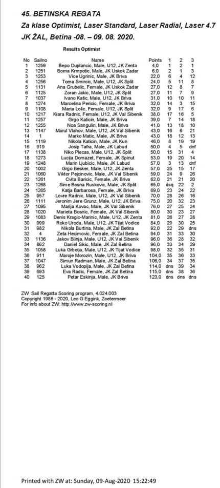 U subotu su Optimisti odjedrili dva plova, dok su u nedjelju odjedrili još samo i treći. I na ovoj regati Zentaš Bepo Duplančić je pokazao zašto je jedan od najboljih kadeta u Dalmaciji, te je osvojio regatu s dva prva i jednim drugim mjestom.