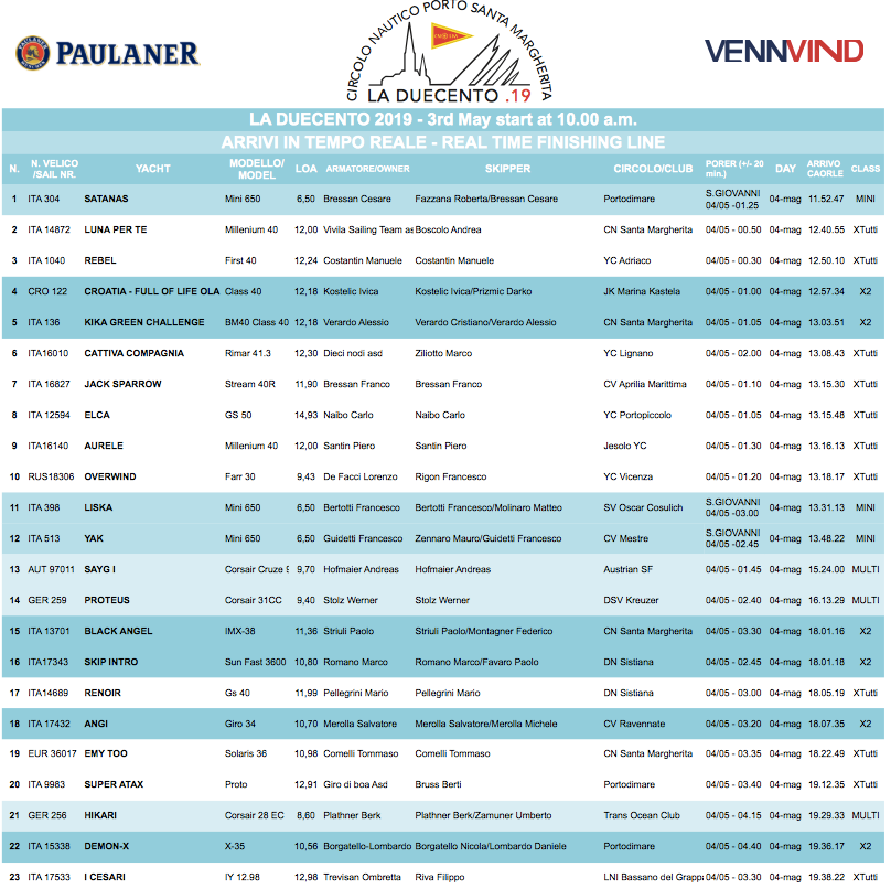 Duecento je bio zanimljiv, uvjeti su bili engleski. Stalno je padala kiša, vjetar je dricavao, uglavnom stalno je bilo škuro.Pa neka bonaca... svega je bilo, a najvažnije je to što smo stalno imali neizvjesnu borbu s drugom četrdesetkom, Kika Green Challenge. A ta borba je trajala do samog kraja regate, jer smo završili sa samo 6 minuta prednosti ispred njih. Također smo završili prvi realno od double handera, ali smo po premjeru bili nešto lošiji. A najzeznutiji dio ove regate je bio transfer iz Caorle do Splita jer smo bili na moru baš kad je prolazila hladna fronta. Imali smo preko 40 čvorova bure i više smo bili pod morem nego iznad. Tako da smo imali i nešto štete, ali dovoljno je vremena do iduće regate da se to sanira. A što se tiče Duecenta moram reći da mi je bio važan jer smo lani imali nesreću s jedrom i bili smo dosta frustrirani zbog te štete. Znali smo da smo favoriti i stvarno nismo imali sreće, pa smo zato došli ove godine s ciljem da pobijedimo i to nam je uspjelo. Ruta regate je bila standardna. Nakon starta imali smo obilazak bove ispred Gradoa, pa obilazak Porera. Do njega smo stigli oko 3-4 u noći i uglavnom je u toj zoni bila bonaca. Ali zato nam je u povratku bilo ugodno jugo i do cilja smo odvozili s podignutim genakerom. Ta noć nam je bila stvarno zanimljiva jer smo cijelo vrijeme jedrili protiv 2-3 jedrilice koje su bile oko nas. Mislili smo da je Kika jedna od njih i tek kad je svanulo smo skužili da je ona 2 milje iza nas. Kasnije smo čuli da je imala nekih tehničkih problema kad su okretali Porer. Ujutro je vjetar ponovno izdušio i Kika nas je ponovno sustigla, odnosno cijela flota je uhvatila priključak. A u to vrijeme smo čak i jedno vrijeme bili vodeći brod u cijeloj floti! Uglavnom, kad se vjetar vratio jedini zadatak nam je bio da stalno pokrivamo Kiku i kontroliramo je do cilja.