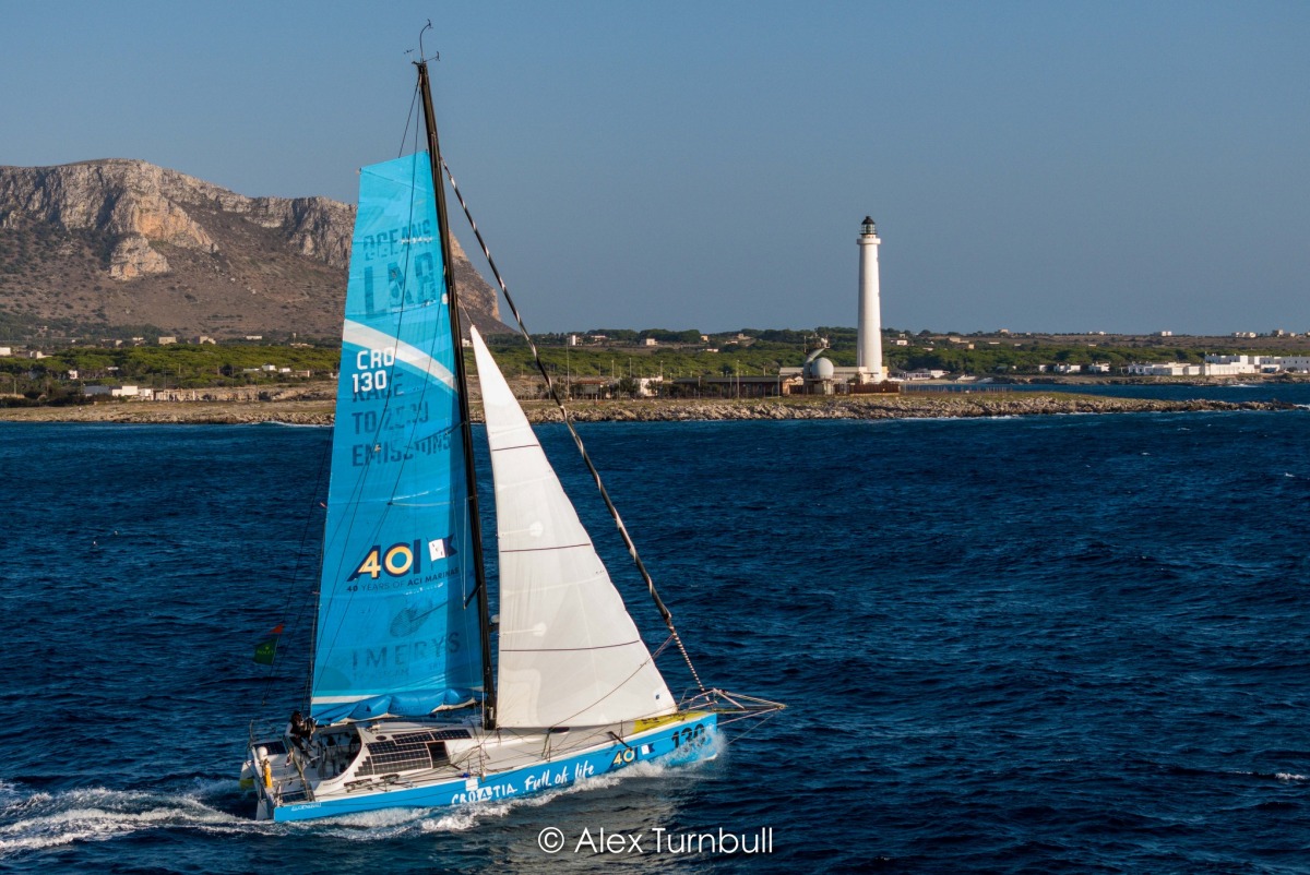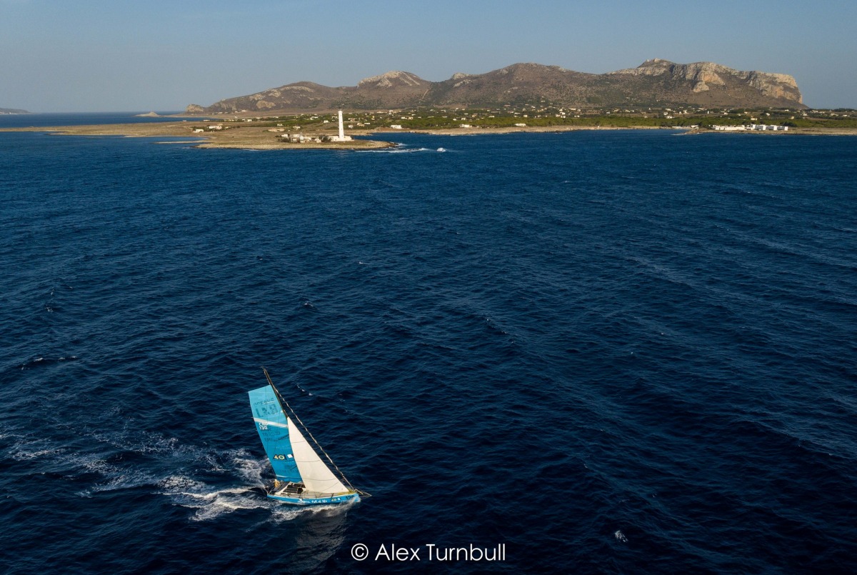Na startu je bilo malo vjetra, ali je zapuhao čim smo se udaljili iz luke. Startali smo vrlo dobro, iz prvog reda. Na prelasku kanala prema Siciliji puše jugo od 15-ak čvorova i jedrimo pod spinakerima. Naši glavni konkurenti Karnak (#121) i Imagin'Act Socomec (#171) dobro su odjedrili preko kanala i mi smo do rta Passero (jugoistočni kraj Sicilije) stigli treći. Imali smo bliski susret s jednim velikim kontejnerašem zbog kojeg smo morali na kratko skinuti spinaker kako bismo ga propustili, što me je jako razbijesnilo. Na moru je bilo dosta marete što je ostala od sinoćnjeg jakog juga.