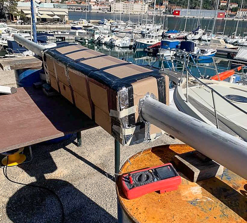 Prvi od završnih koraka je bio da zapečem karbon, a za to sam napravio komoru oko jarbola pomoću kartona i aluminijske folije. To se inače radi da karbon dobije dodatnu tvrdoču, odnosno da bi smola s vlaknima postala jedno.