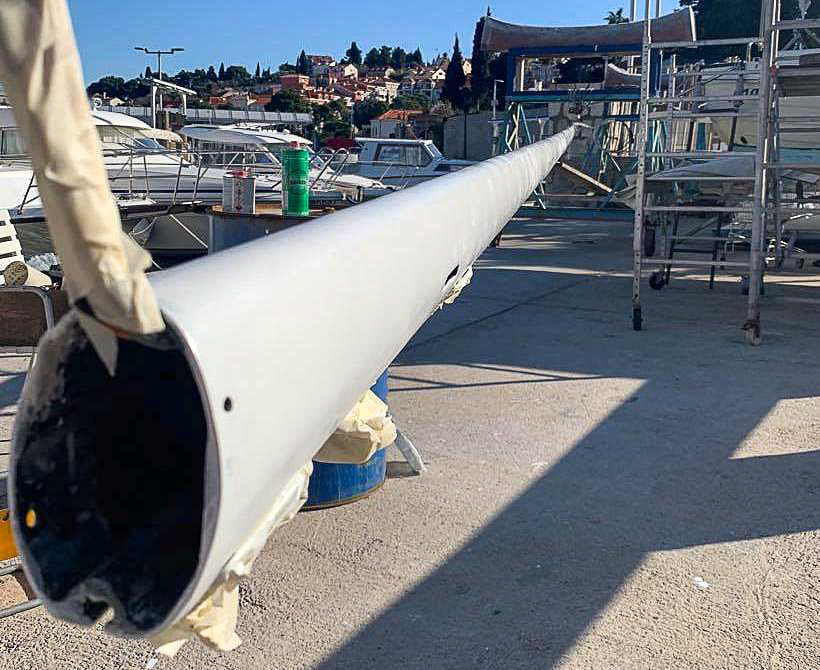 Jarbol je inače 25 godina star i stvarno je trebao novi sloj boje. Skidam ga i stavljam 5-6 puta godišnje, uvijek se negdje dobije neki ožiljak, pa sam iskoristio priliku i za to. Uglavnom, skinuo sam staru boju, cijelog kitao, izbrusio. Zatim pošpricao dvije ruke epoksidnog primera kojeg sam još malo izbrusio, matirao i za kraj je stigla boja koju sam još ispolirao i zaštitio s voskom.