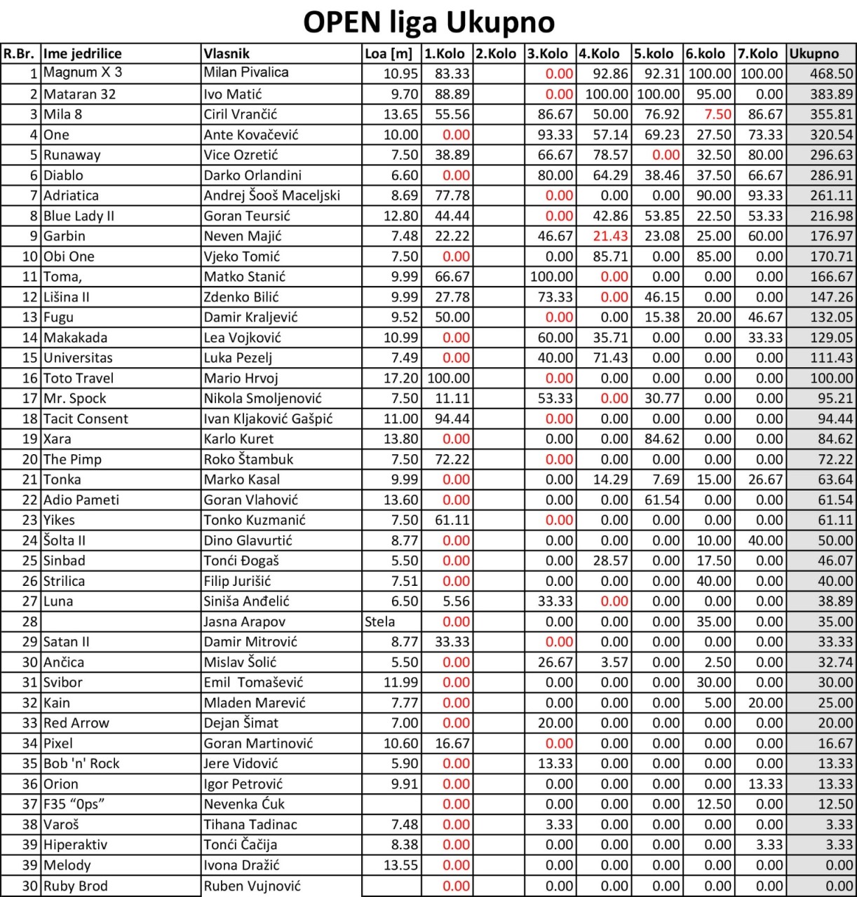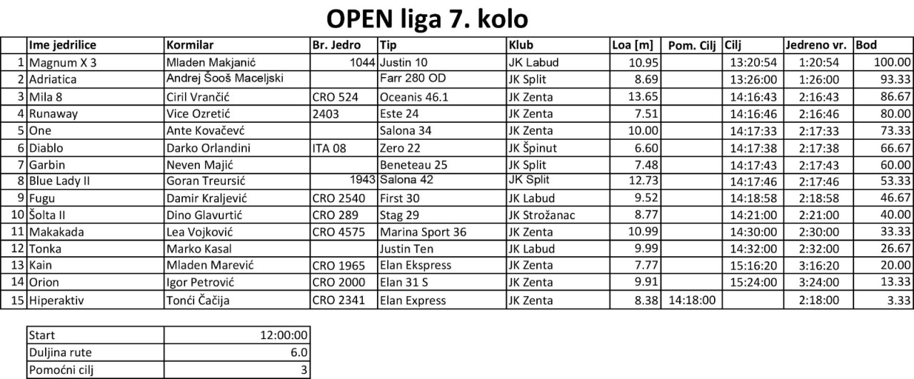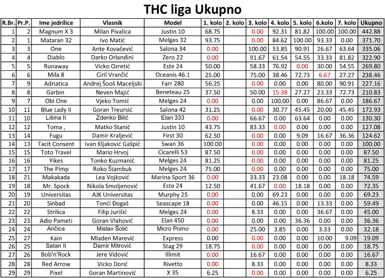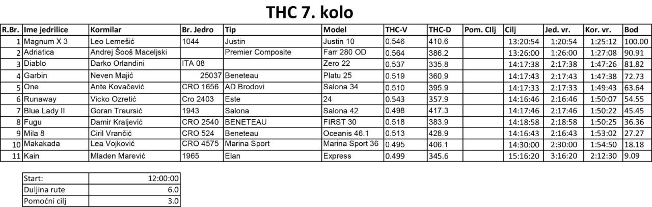 Međutim, ovo nije bila najmanja razlika 7. kola. Još gušće je bilo u borbi za bijeg s 8. mjesta. Taj match je odnijela Blue Lady II s prednošću od 3 korigirane sekunde ispred Fugu-a. Kompletne rezultate po THC-u možete pročitati na ovom linku.