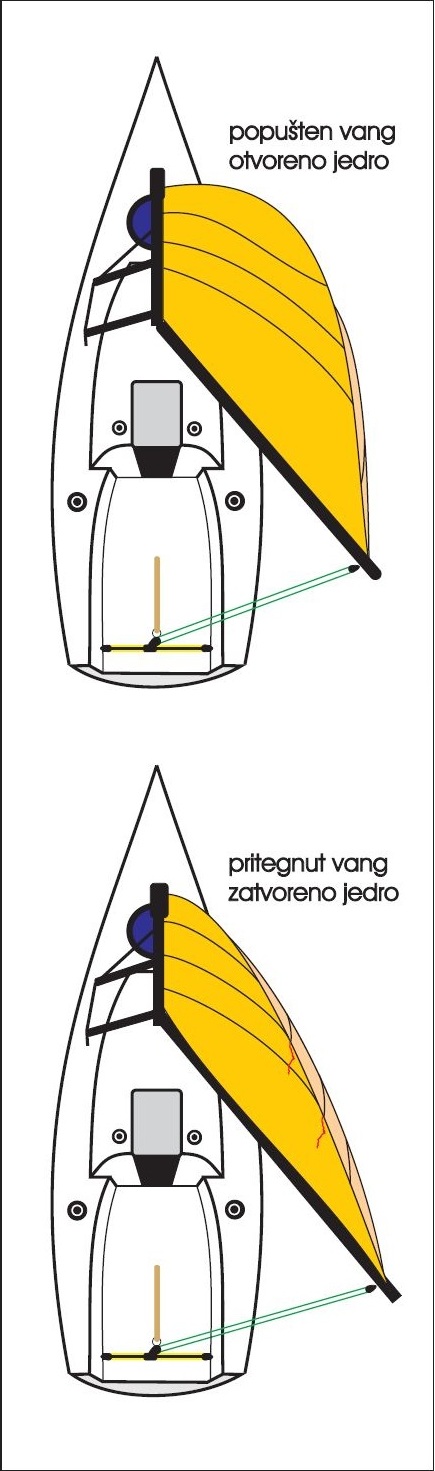 Uz škotu, kada jedrimo s vjetrom u bok, vang postaje najvažnija kontrola. Nakon što je škota popuštena, vang preuzima kontrolu nad oblikom zadnjeg ruba jedra. Popuštanjem vanga zadnji rub jedra se otvara i jedro se izvija, a pritezanjem vanga zadnji rub se zatvara, a jedro prestaje biti izvijeno (slika 4.8). Kod jačeg vjetra popuštanjem škote smanjuje se upadni kut vjetra a time i aerodinamička sila. Popuštanjem vanga smanjenje viška aerodinamičke sile postiže se izvijanjem površine jedra.