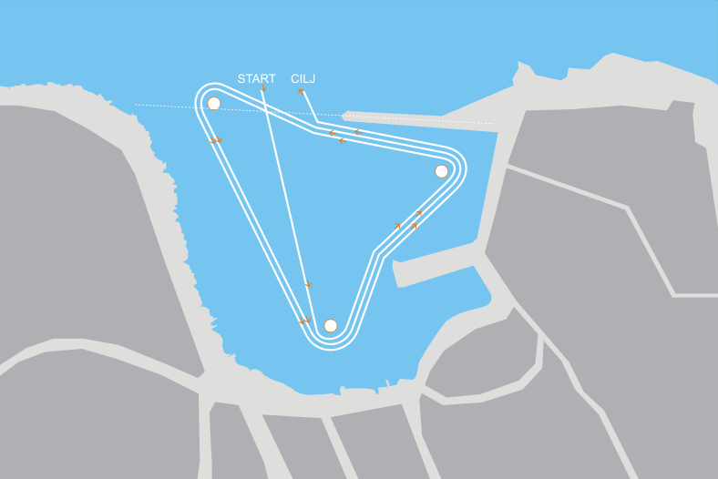 Jedrilice na start čekaju pred ulazom u luku, a linija starta je između vrha mula i bove. S obzirom da vjetar dolazi s kopna riječ je o klasičnom startu u orcu. Zatim slijede tri kruga i izlazak iz porta.