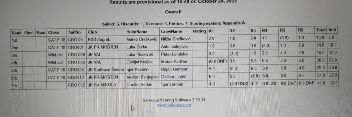 U Šibeniku se protekli vikend, 23. i 24. listopada, odjedrila posljednja ovosezonska regata katamarana klase F18. Program je bio standardan, jedan navigacijskog jedrenja i jedan dan jedrenja u štap polju.