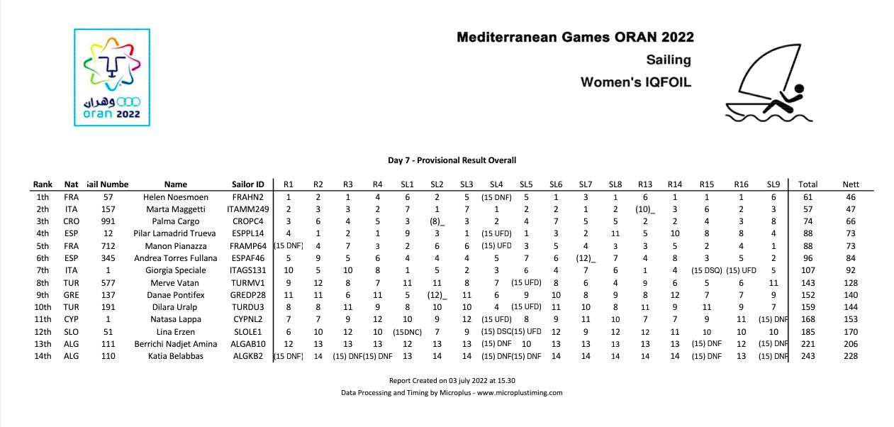 Ovogodišnje Mediteranske igre organizirao je Alžir, a u jedrenju smo imali predstavnike u tri klase. U klasi ILCA 7 jedrila su braća Bruno i Stipe Gašpić, u ILCA 6 jedrila je Elena Vorobeva, a u IQFoilu jedrila je Palma Čargo i osvojila brončanu medalju.