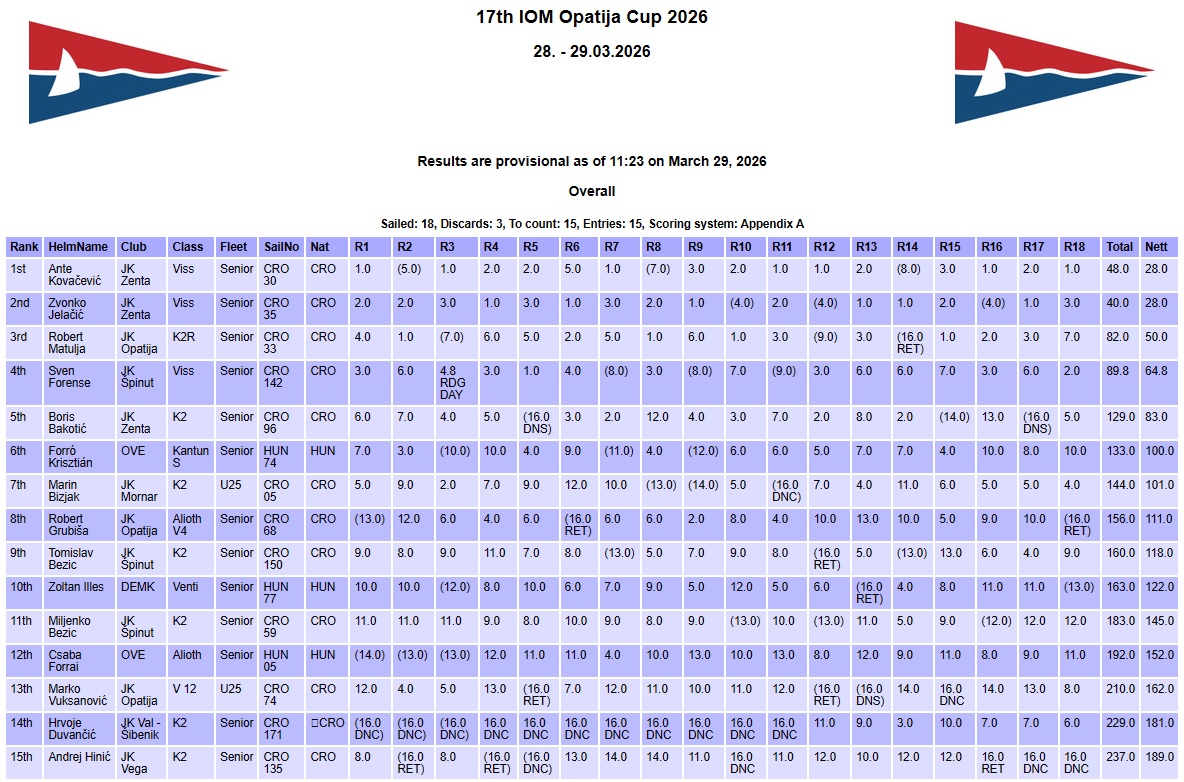 Kompletne rezultate regate možete pronaći na ovom linku, a idući IOM događaj je Otvoreno Prvenstvo Hrvatske koje se jedri u Rogoznici od 9. do 12. travnja.