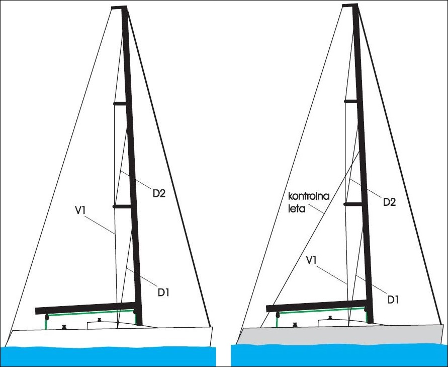 Slika 2.2 - Pritezanjem ili popuštanjem pripona V1, D1 i D2 djeluje se isključivo na poprečnu čvrstoću (krutost) jarbola. Uzdužno savijanje jarbola i luk prednjeg leta regulira se ostalim kontrolama: krmenim letom, donjim i gornjim kontrolnim letima (lijeva slika). Promjenom tenzije pripona V1 djeluje se na luk prednjeg leta i uzdužnu savijenost jarbola. Promjenom tenzije pripona D1 i D2 djeluje se na poprečnu i uzdužnu savijenost u srednjem, odnosno u donjem dijelu jarbola (desna slika).