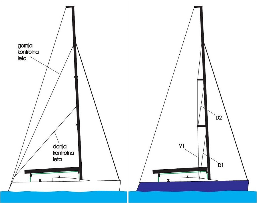 Gornji par kontrolnih leta bit će smješten u točki u kojoj je hvatište prednjeg leta, a donji par negdje na polovici jarbola (slika 2.2). Gornja kontrolna leta održavaju pritegnutost prednjeg leta, a donja savijenost srednjeg dijela jarbola.
